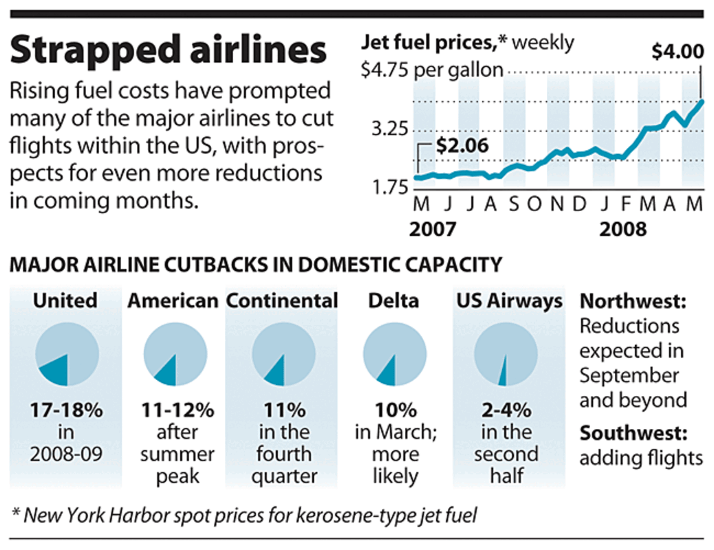 Surging oil prices, driving up the cost of jet fuel, are behind the cuts. For the first time in aviation history, airlines are forced to reduce the number of flights offered and eliminate some destinations even as demand for their services remains high.