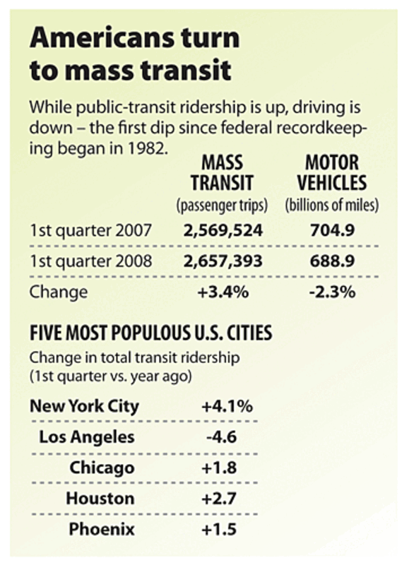One of the unresolved questions is how long the surge in mass transit ridership will last. Overall, mass transit ridership climbed 3.4 percent during the first quarter of 2008 compared with the same period last year, according to APTA.