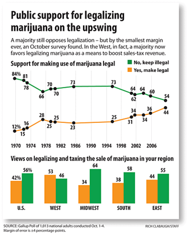 There's no question, however, that American attitudes toward marijuana have changed. National polls show that Americans increasingly favor legalizing marijuana. More than 40 percent of Americans consistently supported legalization this year. Gallup surveys put that support at 44 percent now, up from 25 percent in 1995.