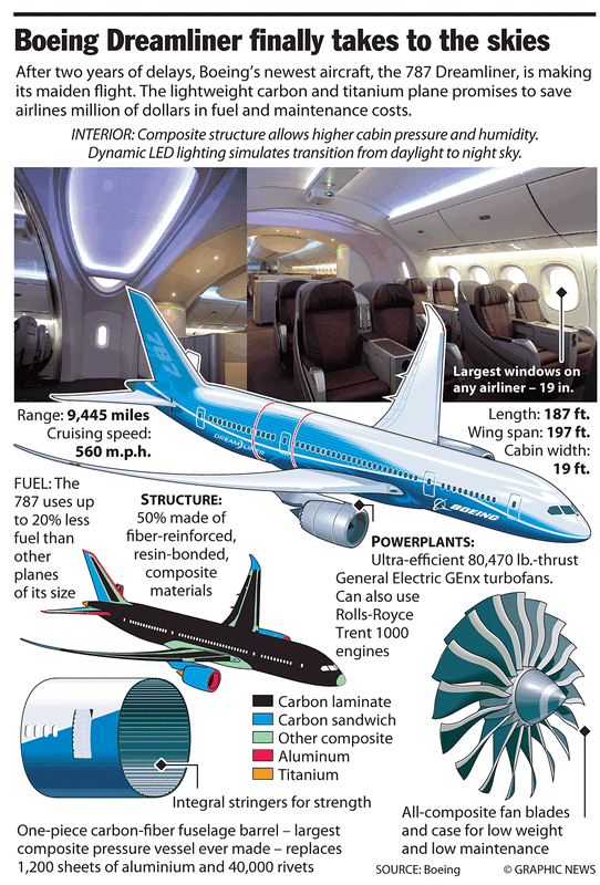 As the first airliner to be constructed mainly of lightweight composite materials 鈥 carbon and titanium 鈥 the 787 also sets the pace for the next generation of more efficient commercial aircraft.