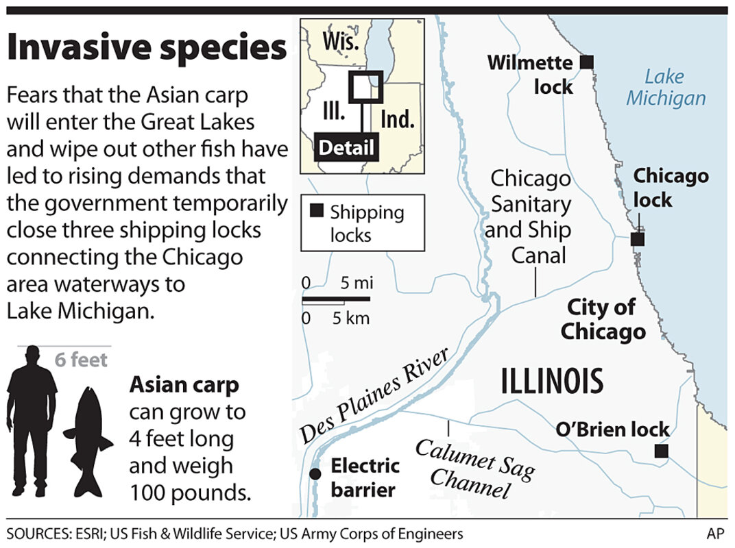 The lawsuit, filed Monday, follows the discovery in early December of a single Asian carp about six miles from the Lake Michigan鈥檚 Chicago coast. The fish, a bottom feeder, is presumed to have entered the Chicago Sanitary and Ship Canal, which links Lake Michigan to a tributary of the Mississippi River. The species has gradually migrated northward from Mississippi and Arkansas, where the fish were introduced in the 1970s to help clean catfish farms.