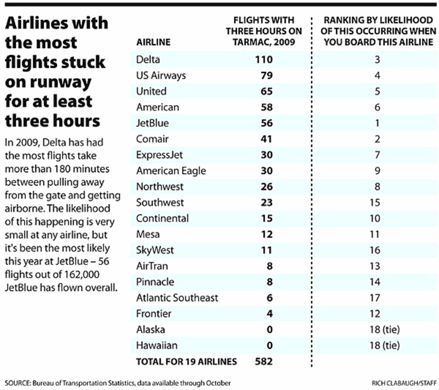 The accompanying chart shows fuller data, ranking 19 large airlines, with numbers (BTS). Although Delta has the most three-plus-hour incidents, JetBlue ranks as the airline on which passengers are most likely to see "taxi-out" time exceed three hours, according to the BTS data. That's the same airline that made headlines two years ago for a Valentine's Day flight on which passengers were stuck on the ground in New York for nearly 11 hours.