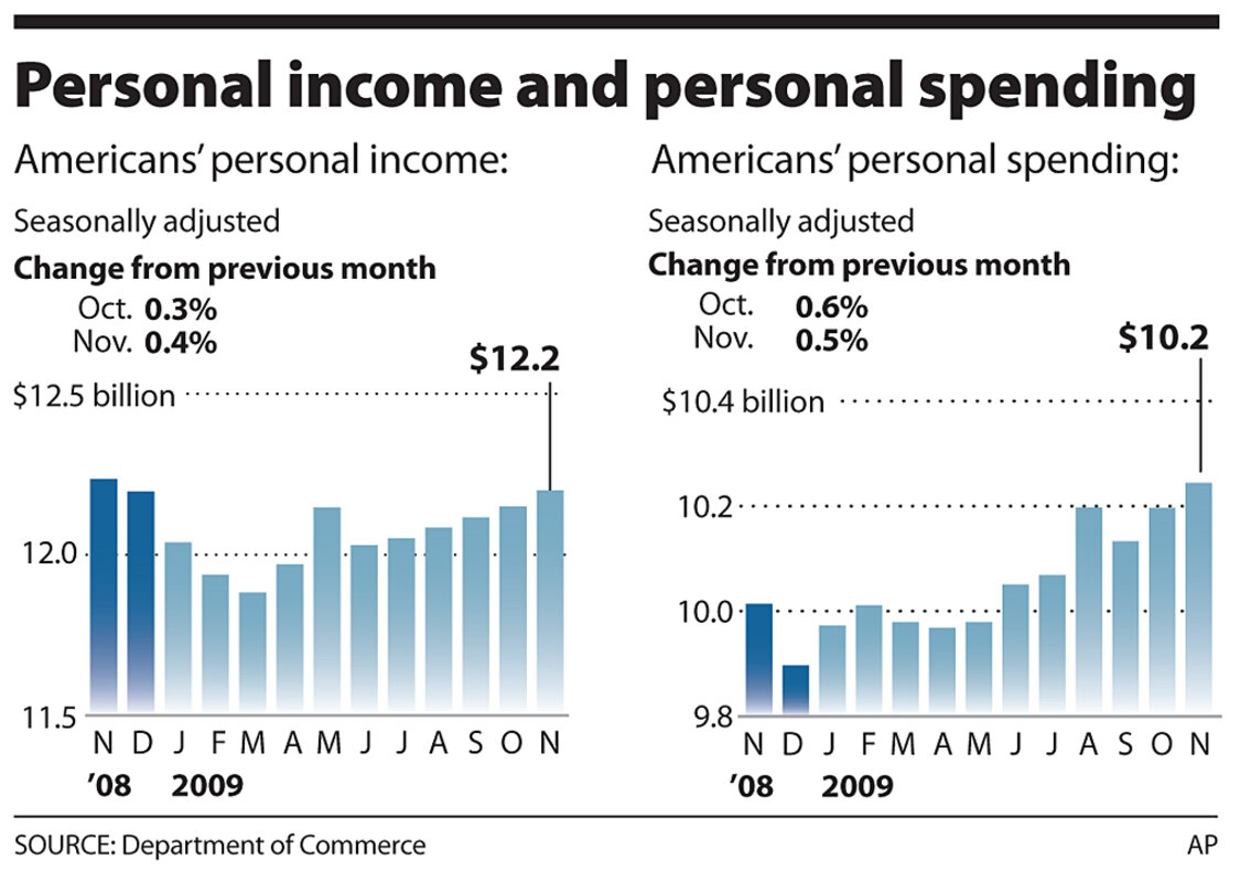 The picture is still not one of a brisk rebound for the economy. Much of the gain in incomes continues to come from government stimulus programs, and the gains in income and spending are smaller when inflation is taken into account. (Adjusting for inflation, personal income rose 0.2 percent in November. The gain was just 0.1 percent when the impact of government transfer payments is subtracted.)