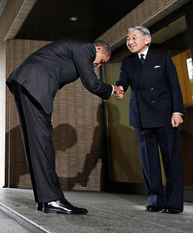 (Obama was criticized by conservatives for being too accommodating in Asia, symbolized by the president鈥檚 deep bow and handshake to Japanese Emperor Akihito in Tokyo. The New Yorker magazine subsequently had great fun with the 鈥渨ow bow,鈥 depicting on its Dec. 14 cover Obama bowing to and shaking the velvety glove of a jolly red-suited fellow who has just come down the Oval Office chimney.)