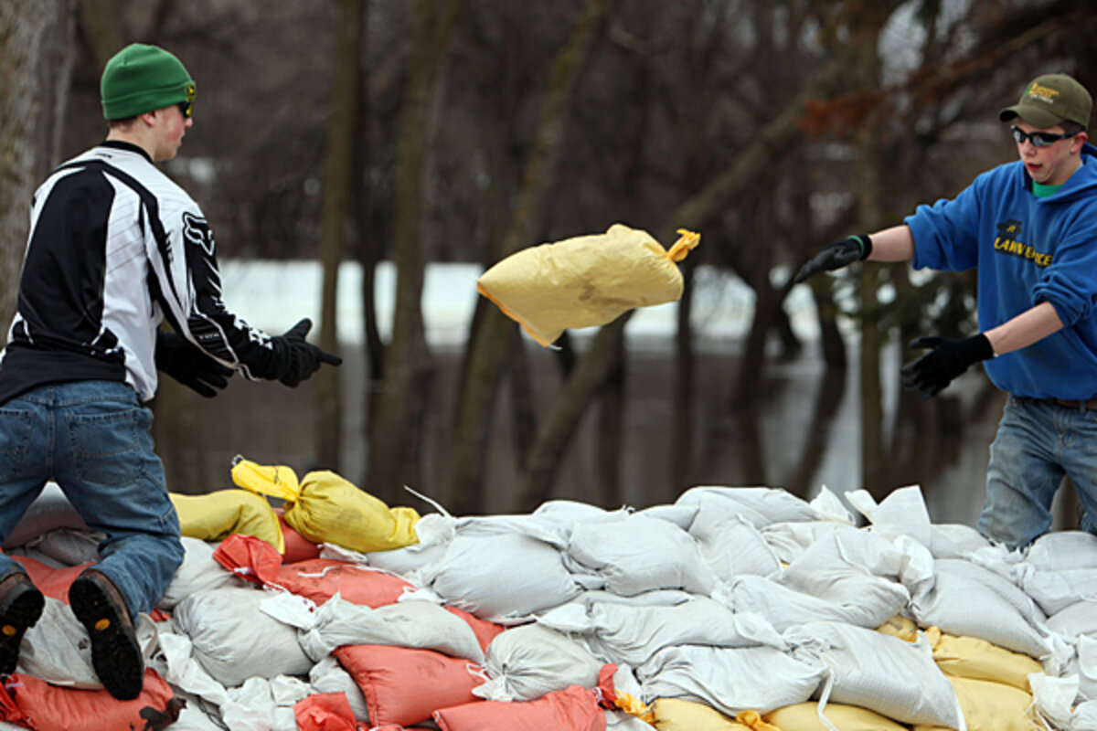 Residents in Fargo, N.D., and Moorhead, Minn., are sandbagging homes and reinforcing dikes and levees as the Red River continues to rise. It is forecast to crest Saturday about 20 feet above flood stage. The river crested at 22 feet above flood stage in 2009, setting an all-time record, according to NOAA.