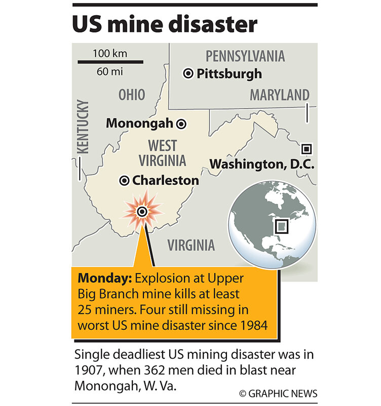 An explosion Monday that left at least 25 miners dead (four are still unaccounted for) is the worst US mining disaster since 1984, when 27 died in a fire at a Utah mine.
