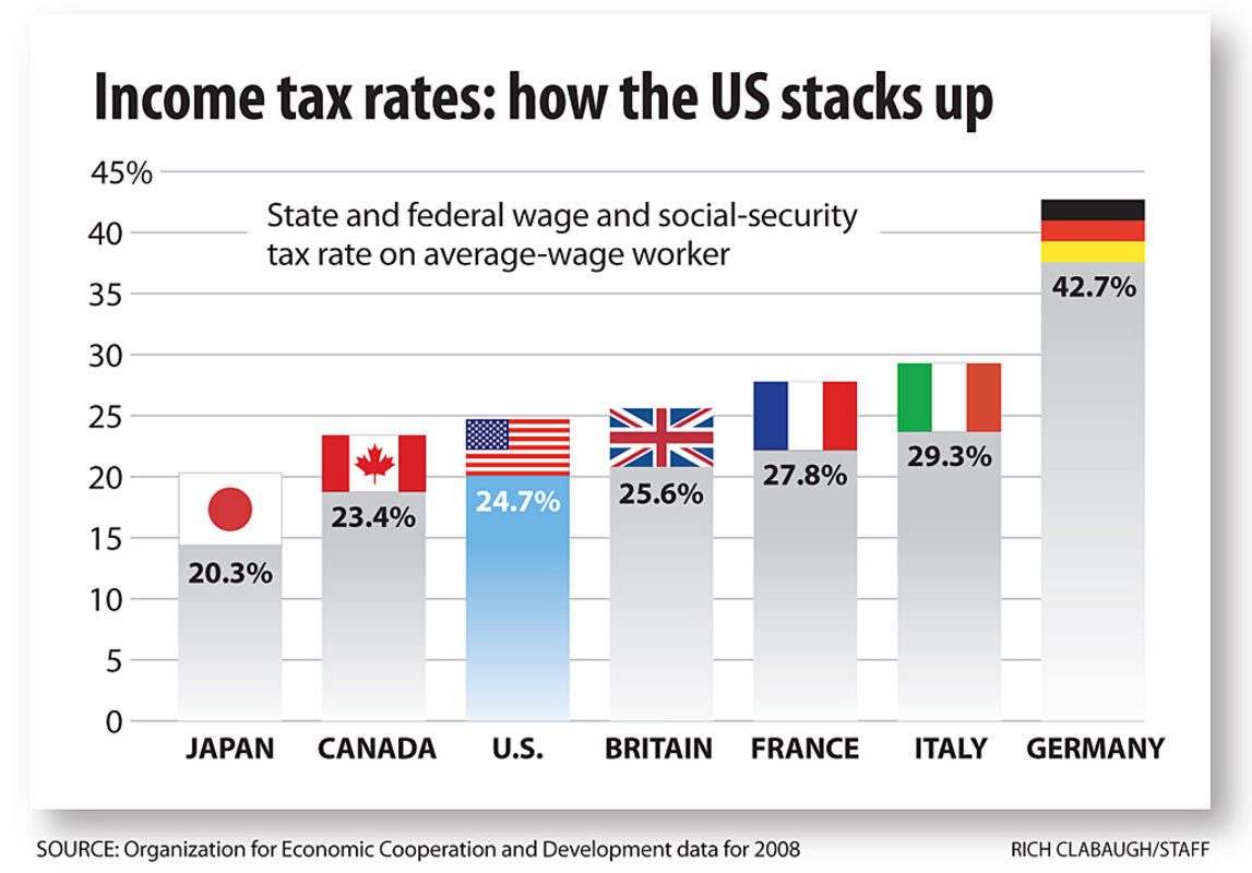 The average American pays wage-based taxes that are similar to what Britons pay 鈥 and not much lower than in France. Japanese citizens enjoy the lowest rates among the Group of Seven large industrial economies, or G-7. This includes national and local income taxes, plus payroll levies such as the employee share of Social Security.