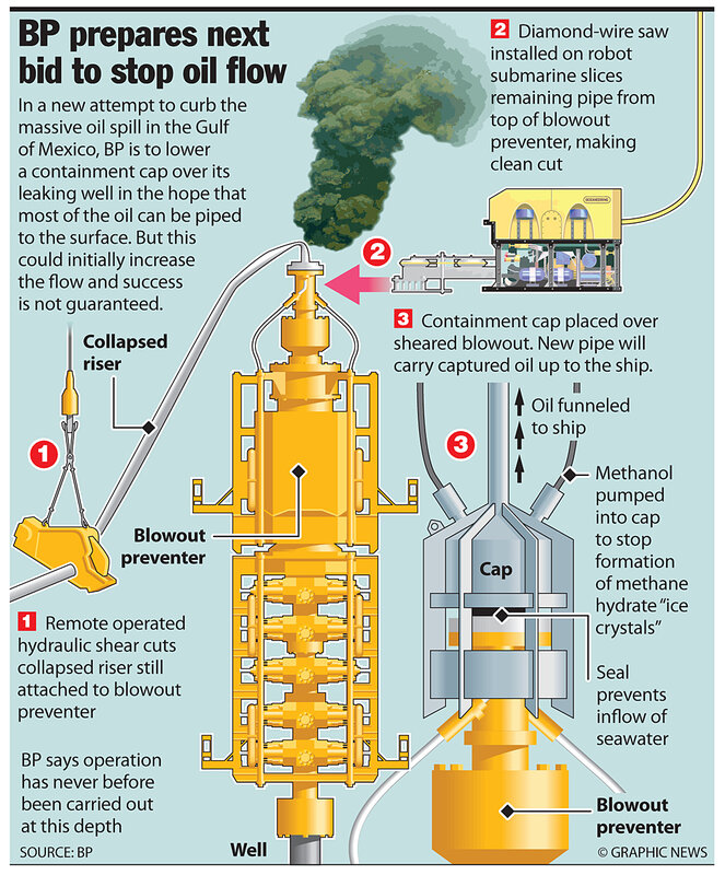 The smoothness of the final cut will determine whether BP can put a tight-sealing "top cap" on the riser package or will have to go with a looser "top hat" that would allow more oil to escape. Once the final cut is made, the oil flow could increase by as much as 20 percent (hopefully temporarily), according to a NOAA study group. Already, between 12,000 and 19,000 barrels of oil are leaking into the Gulf every day, according to the best government estimates.