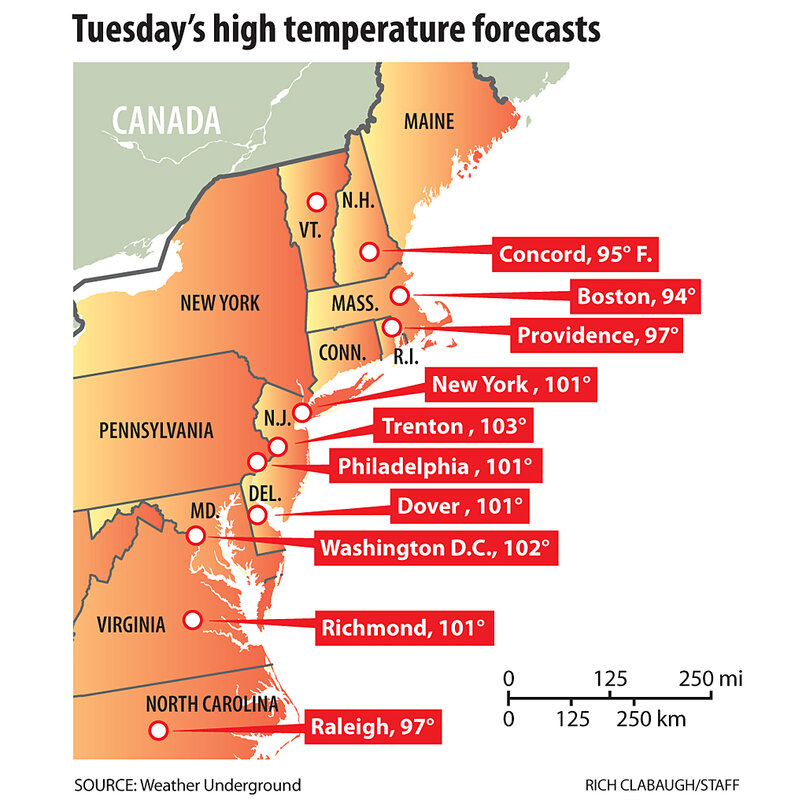 Boston. The heat is also on in New England, even in places where temps may not officially enter the triple digits. The Boston forecast calls for high 90s in the day and an evening low around 75 Tuesday, but it may take awhile for bedrooms to actually get down to that zone of relative comfort.