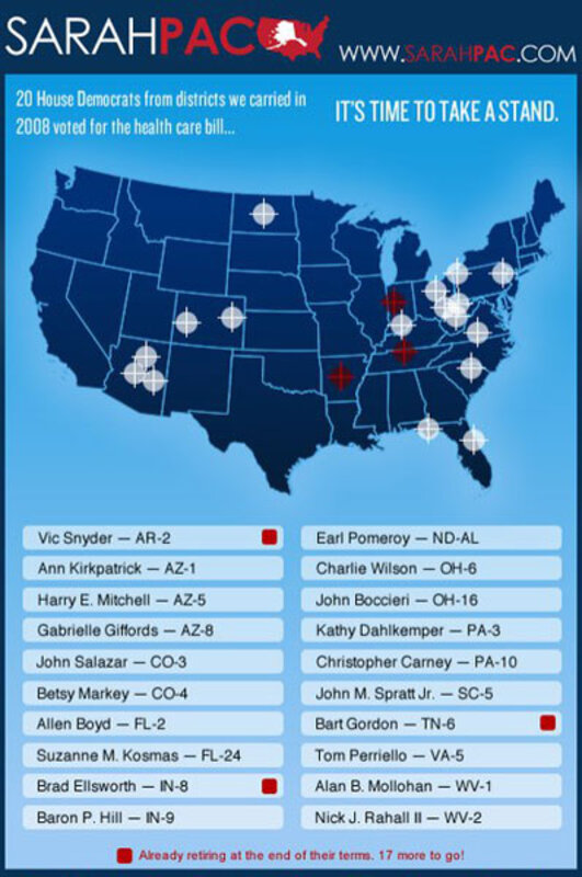 Her district was identified by Sarah Palin as a potential target of opportunity for Republicans seeking to regain control of the House of Representatives. The Palin website has been criticized for using what appear to be the cross-hairs of a gun sight on a US map to show the location of 20 vulnerable districts.