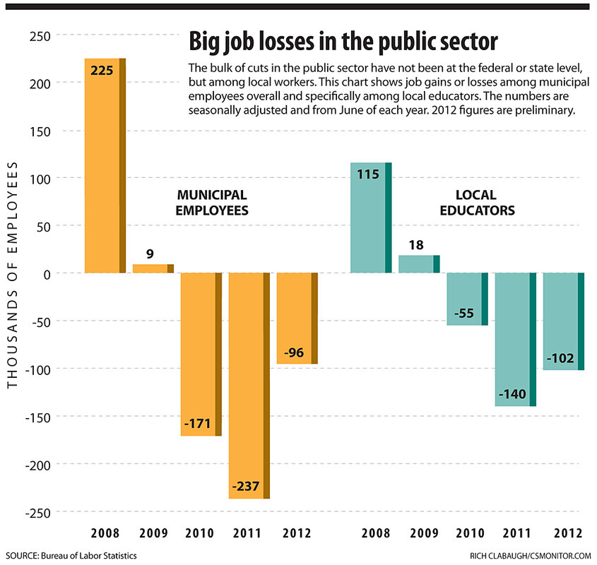 The government sector has lost 627,000 jobs since June 2009, according to the US Bureau of Labor Statistics (BLS).聽The bulk of the cuts 鈥 some 504,000 鈥 has not been at the federal or state level, but among local workers.