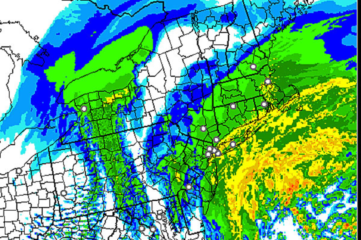 As the two storms collide (see explanation below), and the low coming out of the Ohio valley injects cold air and the sun goes down, NYC is expected to turn to all snow and winds will pick up. Expect blizzard conditions to arrive around 6 p.m. in the New York City area.