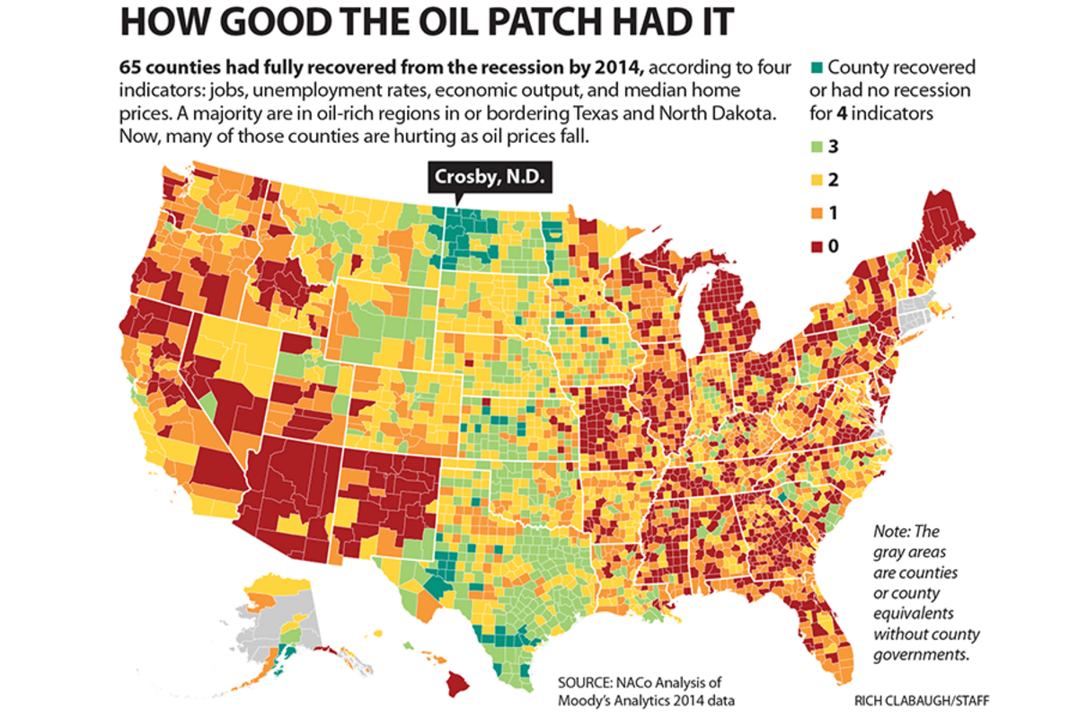 In many ways, this lonely swath of North Dakota is a bellwether for America鈥檚 energy economy. Twenty-two of the 65 American counties that had fully recovered from the recession by 2014 were in or bordering North Dakota, according to a study by the National Association of Counties. Only Texas (with 24) accounted for more. So when Crosby鈥檚 once-bustling Main Street is less harried than it once was, and when fewer landmen are crowding into the rotunda of the county courthouse to scour mineral rights records for Divide County, it is a hint that oil-dependent towns from Ohio to California might soon be feeling the pinch.