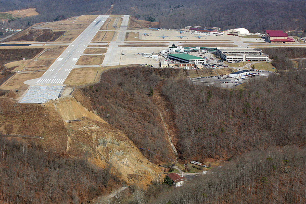 The landslide began Sunday near the end of the main runway at Yeager Airport and broke loose Thursday, taking out power lines, trees, an unoccupied home, and a church. It also caused a nearby creek to rise, and crews worked Friday to remove debris from the creek.