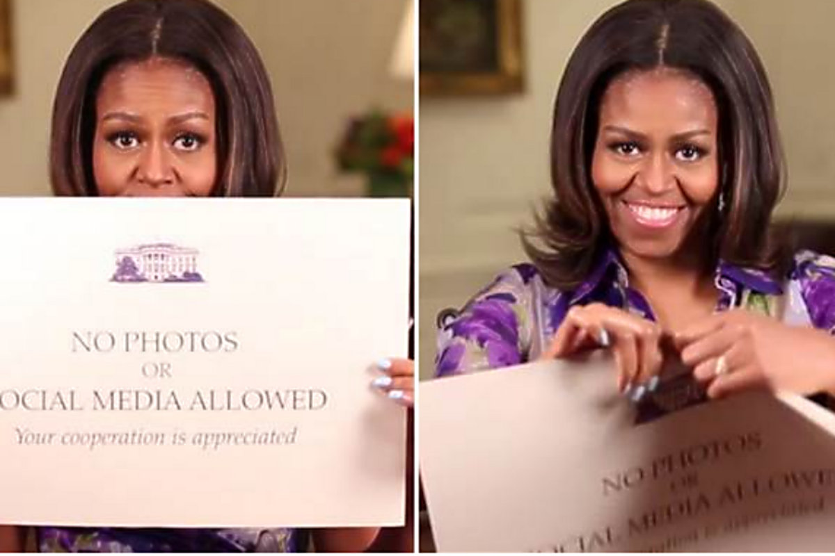 That announcement comes from聽Michelle聽Obama聽in a video posted on her Instagram account. She's seen ripping in half a sign that's been displayed during tour hours and says "no photos or social media allowed."