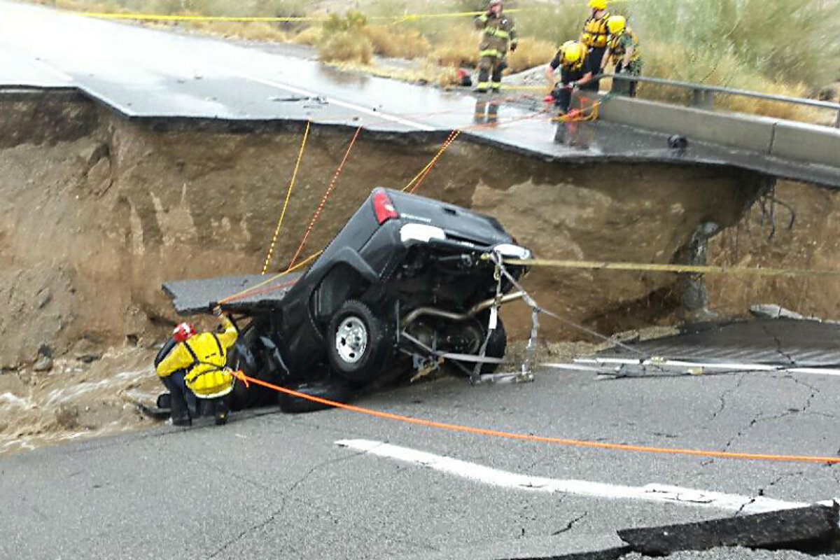 The bridge for eastbound traffic about 15 feet above the wash about 50 miles west of the Arizona state line gave way and ended up in the flooding water below, the California Highway Patrol said, blocking all traffic headed toward Arizona. One driver of a pickup truck that fell with the freeway had moderate injuries, officials said.