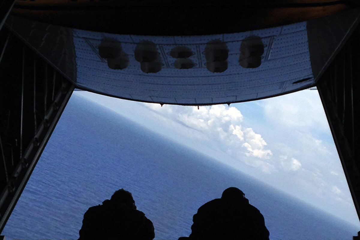 Five hundred feet above the Atlantic on Tuesday, an eight-person Coast Guard crew aboard a C-130 plane flew in a grid pattern to survey the ocean below. Two men flopped on their bellies on a cargo ramp, scouring the waters below, while other crew members searched from the windows or used a joystick to manipulate a camera scanning murky seas. Occasionally, they spotted something and looped around, sometimes dropping flares.