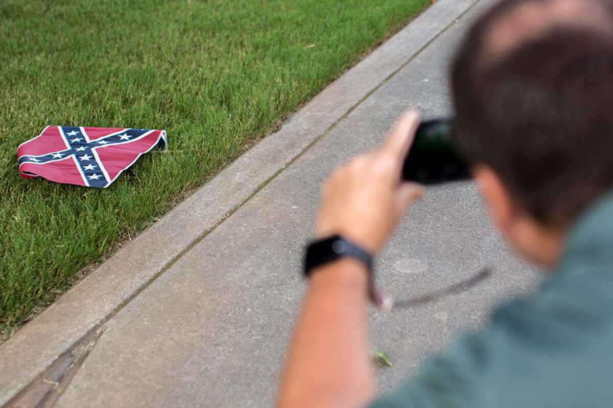 The flags weren't stuck in the ground but instead laid flat. One was placed near a bell tower under a poster that said: "Black Lives Matter." The slogan, which has been spray-painted on Confederate monuments across the South this summer, has become part of a movement of civil rights supporters who say police treat blacks unfairly.