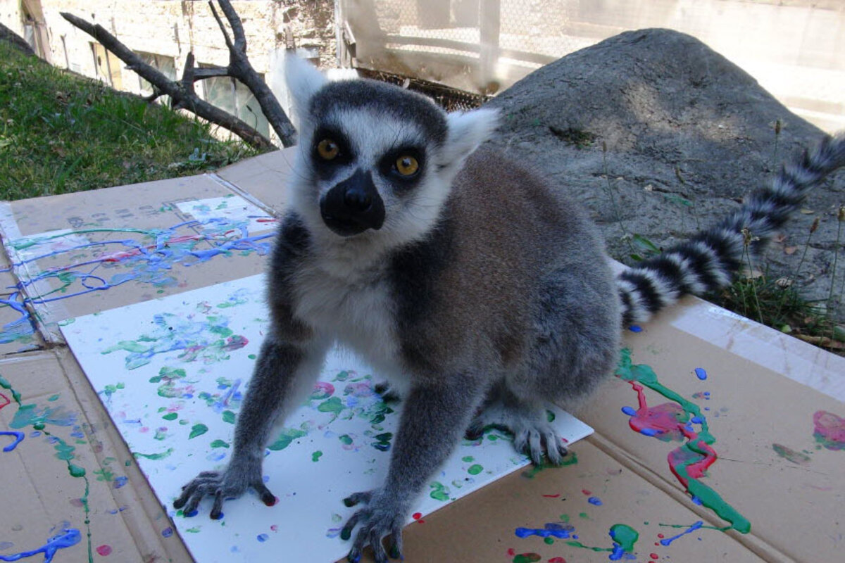 Elephants held paintbrushes in their trunks and giraffes held brushes in their mouths, and produced their artwork, as most painters do, one stroke at a time. Goats, lemurs, and meerkats were motivated across posterboard with treats, their hooves, feet, and claws, respectively, dipped in paint to create the artwork.