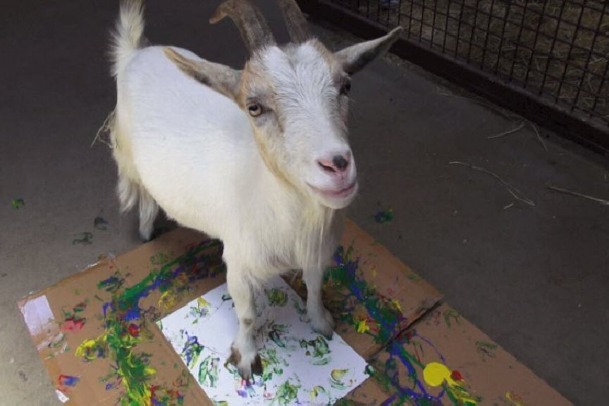 Maggie, a Nigerian dwarf goat, had her hooves dipped in blue, green and yellow paint and the keeper coaxed her with snacks to walk on a canvas.