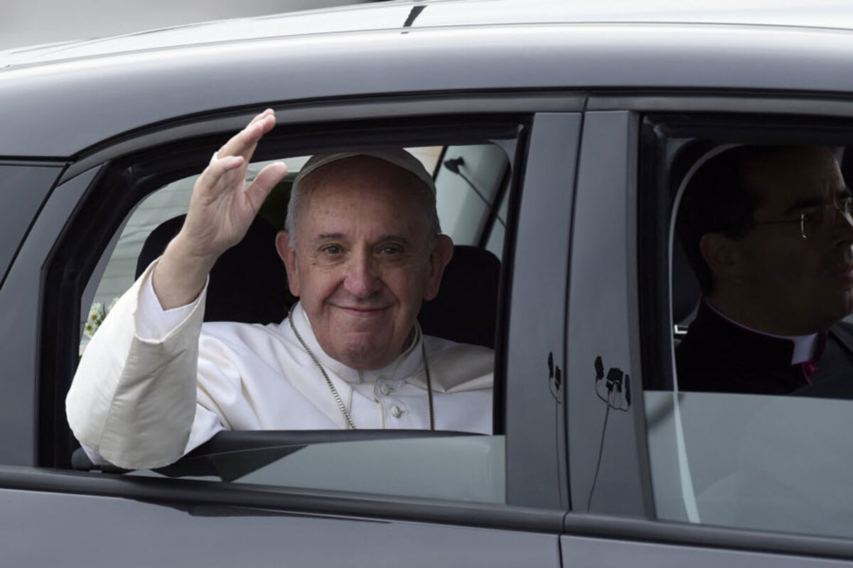 From the airport, Francis rode by motorcade to the downtown Cathedral Basilica of Sts. Peter and Paul to celebrate a Mass for about 1,600 people, twice turning around to wave to the hundreds of cheering people standing outside the church.
