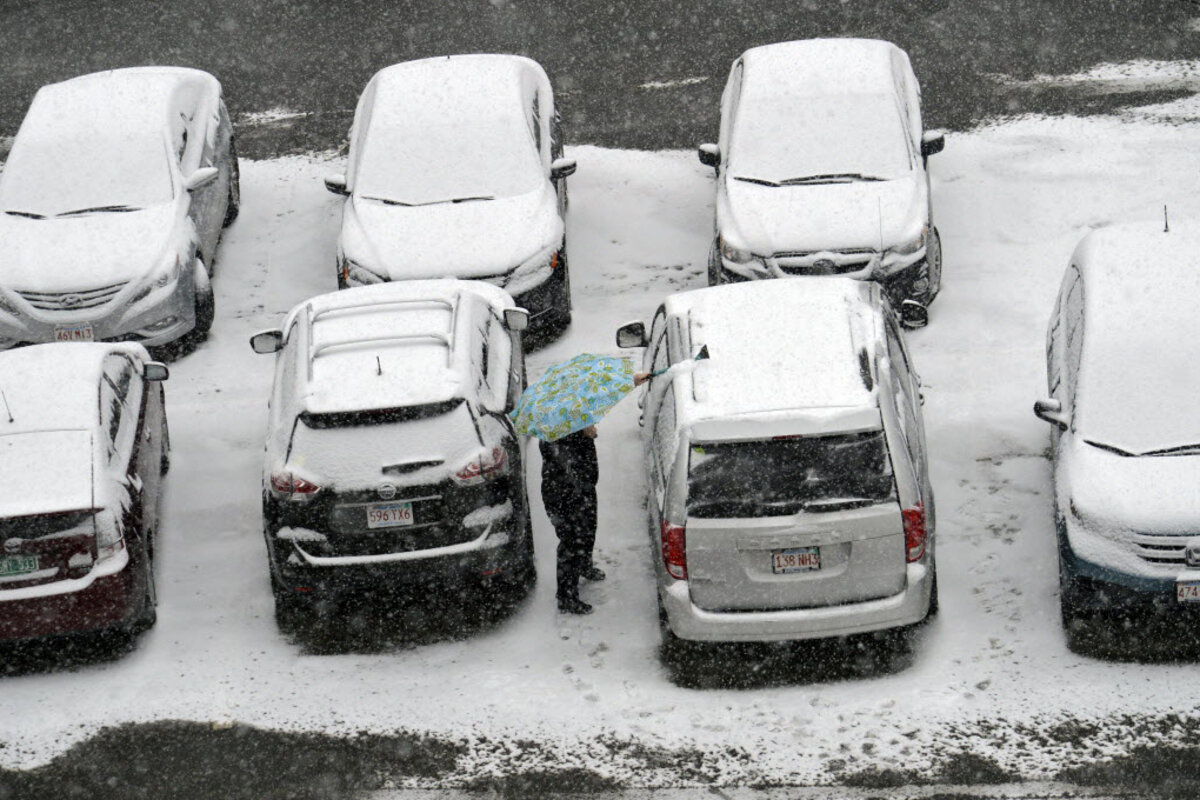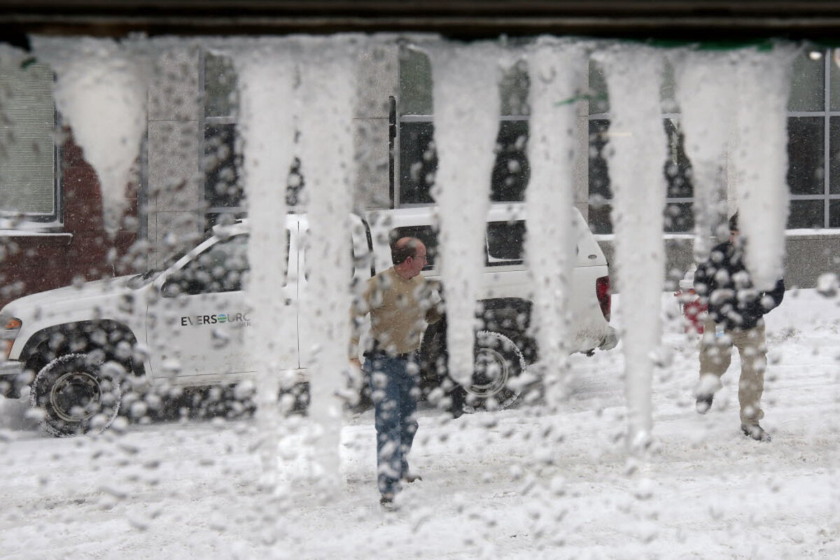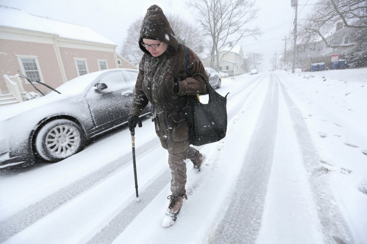 Sideways snow lashes New England coast