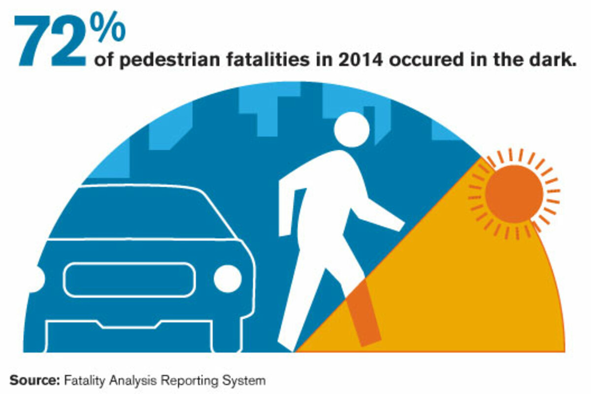Also notable, 72 percent of all pedestrian fatalities in 2014 occurred in the dark. And over 75 percent of all deaths happened somewhere other than at an intersection, suggesting pedestrians are safer using crosswalks.聽
