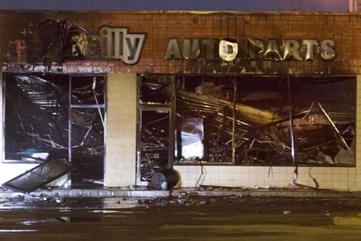 A bank, a gas station, an auto parts store and a beauty supplies shop were burned in the violence. Firefighters held back from the gas station blaze because of gunshots.