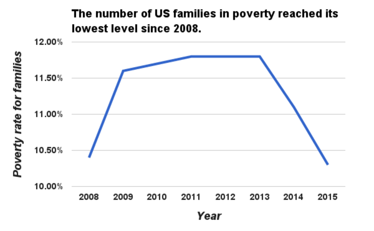 In 2015, the poverty rate for US families was 10.4 percent, the lowest level since 2008.