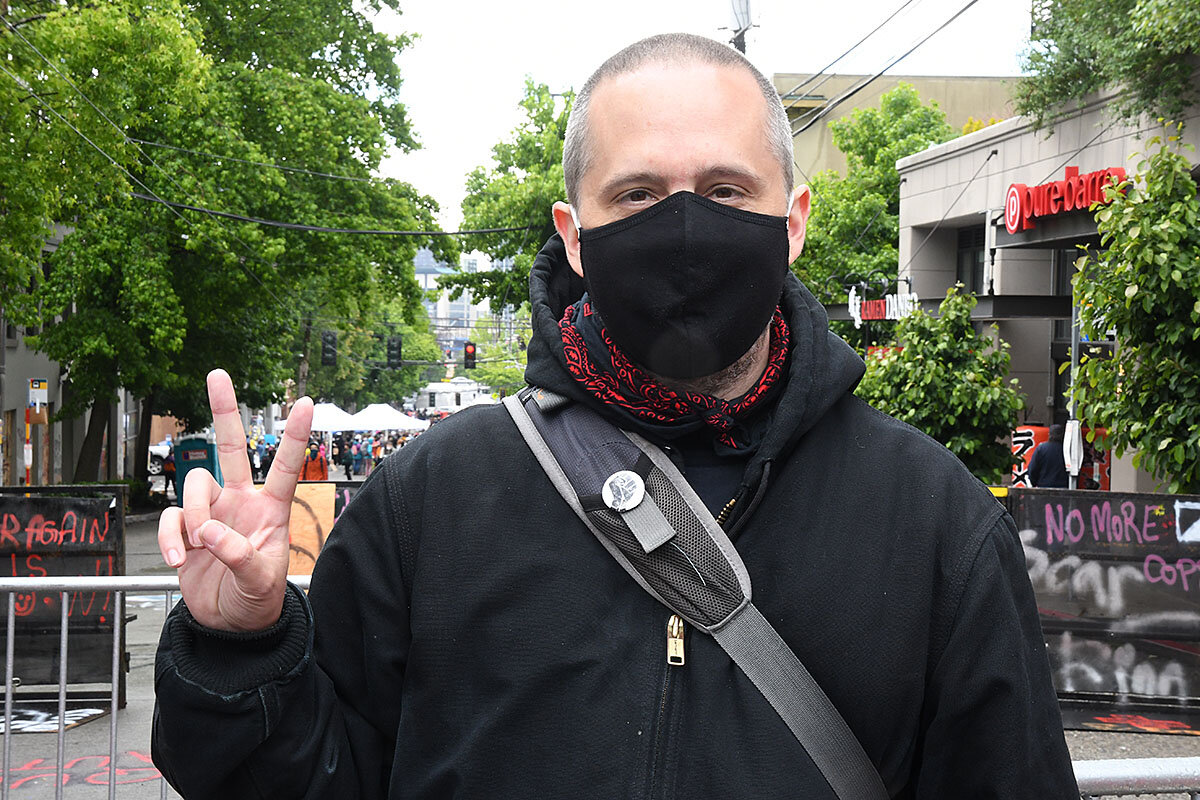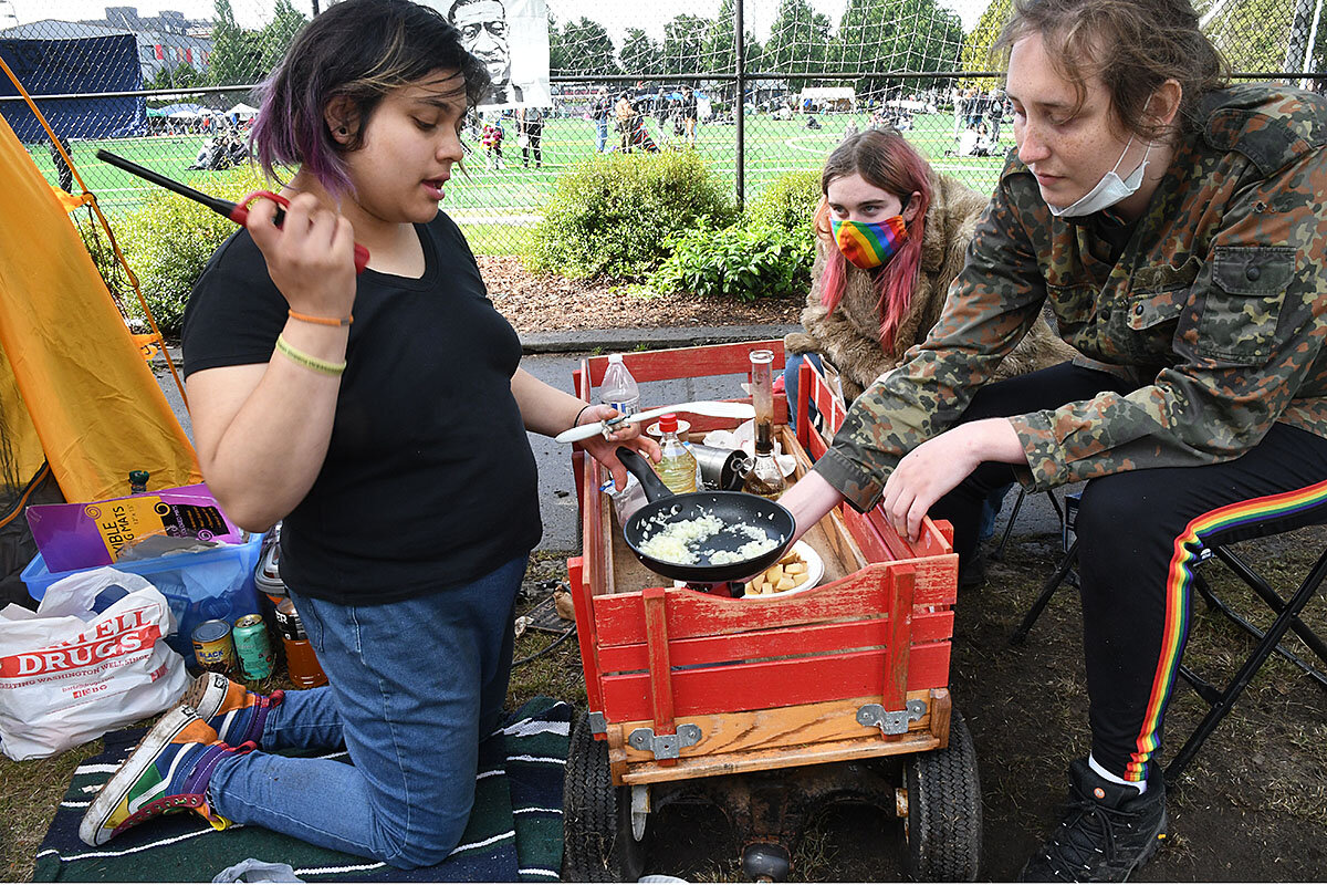 On the leafy streets of Capitol Hill, the multiracial community of protesters ranges from professionals with remote day jobs to laid-off workers and homeless people. Activists have set up tents for shelter and started a community garden in Cal Anderson Park. Donated food and medical supplies, including gloves, masks, and hand-sanitizer to fend off the coronavirus, are distributed from sidewalk stalls. Everyone pitches in to pick up trash.