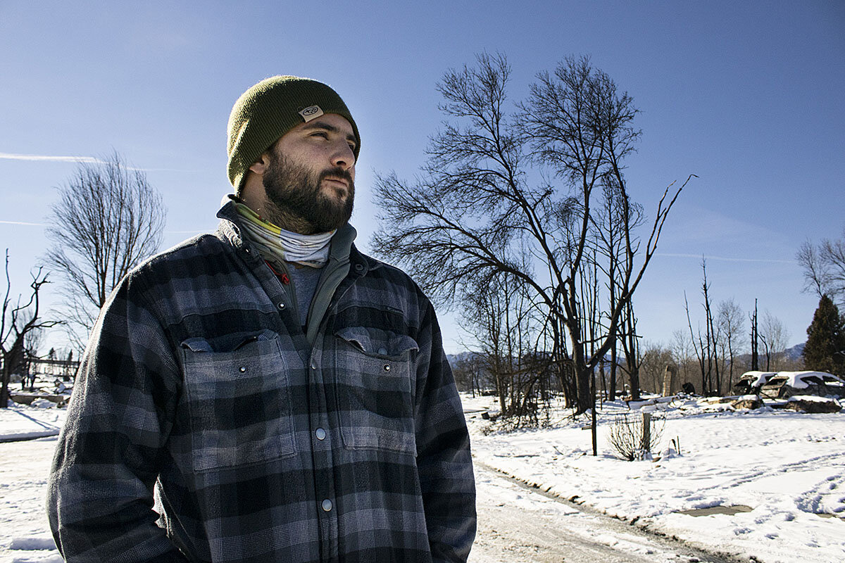Seth Lopez stands in the snow near the entrance 鈥 his first time back. The landscape designer had hoped to walk down to his aunt and uncle鈥檚 home, which he鈥檇 been moving into before it burned. The remainder of his belongings are in his car: two loads of laundry, Christmas gifts, power tools.