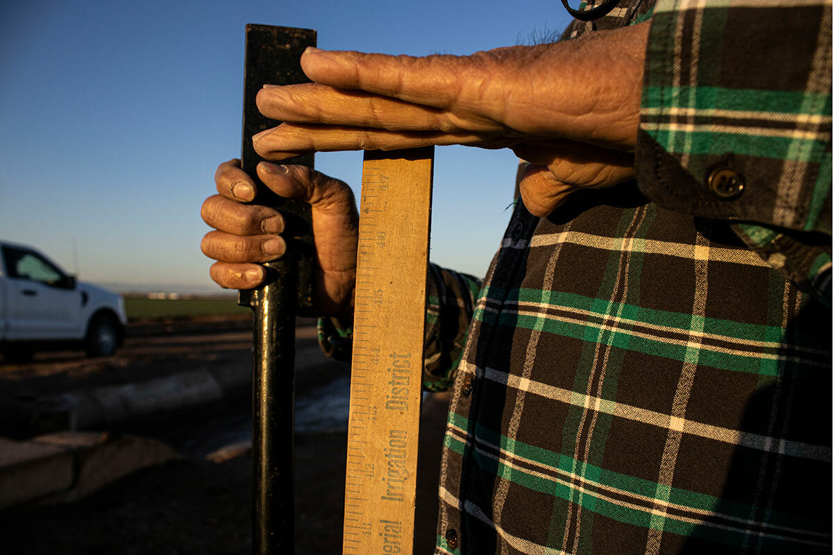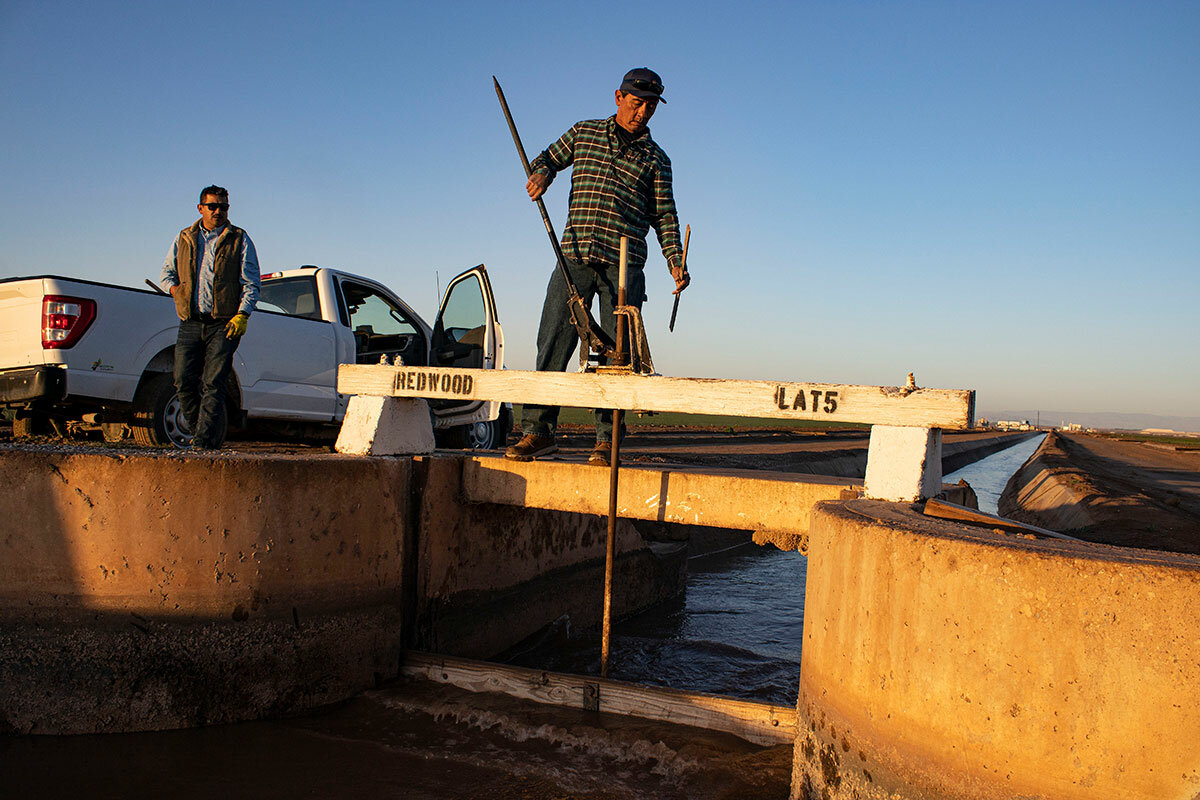 Today on the Redwood Canal, he’s tasked with delivering water measured in cubic feet per second. At one stop, he raises a gate a mere inch higher to adjust the flow.