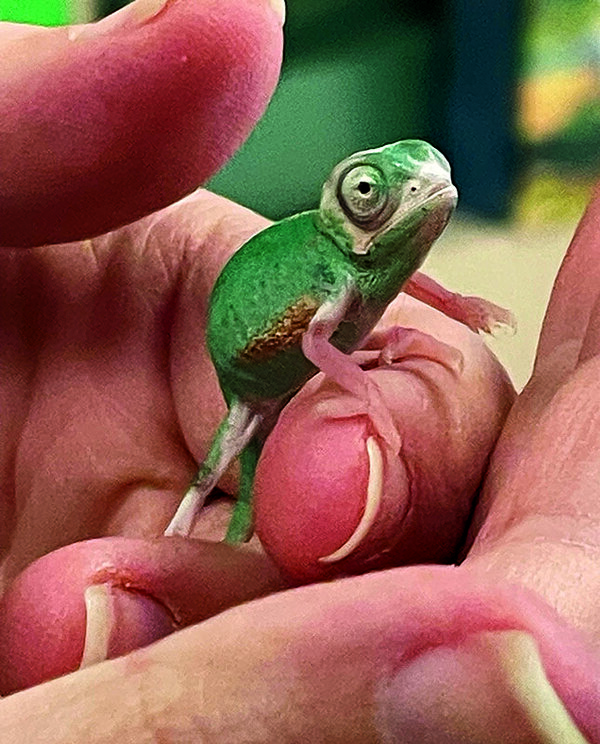 Jarrod McFarland of Providence, Rhode Island, brings in his pet chameleon, Skittles, on a cloudy April day. He cradles the small animal in his outstretched hand, scaly legs in a pattern of scarlet, lime-green, and sky-blue clinging tightly to his fingers.