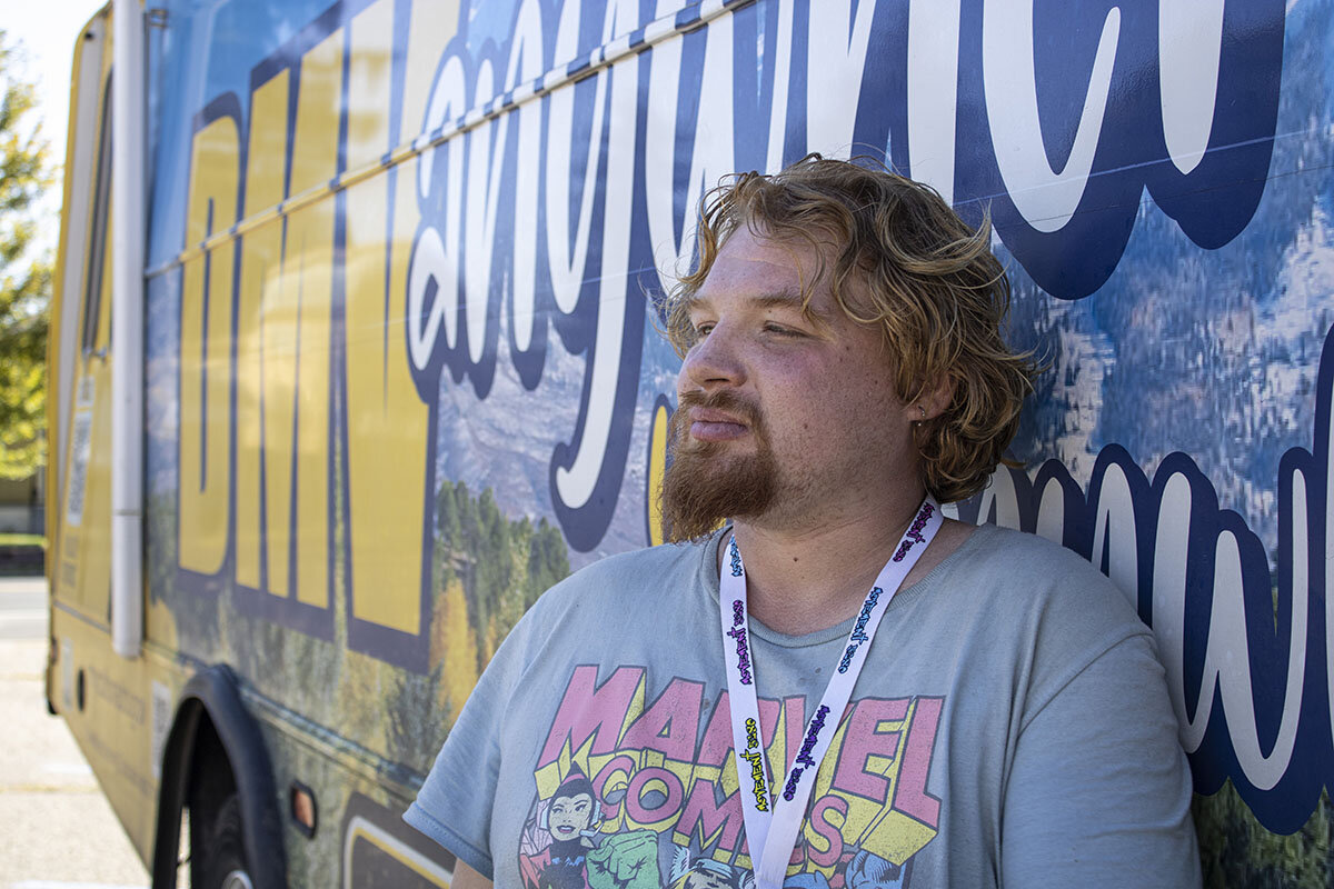 Radio in hand, Steven Rustemeyer ushers the next person aboard the bus. 鈥淗ead on up, buddy,鈥 says the helper, stationed in a sunlit parking lot in Englewood, Colorado.