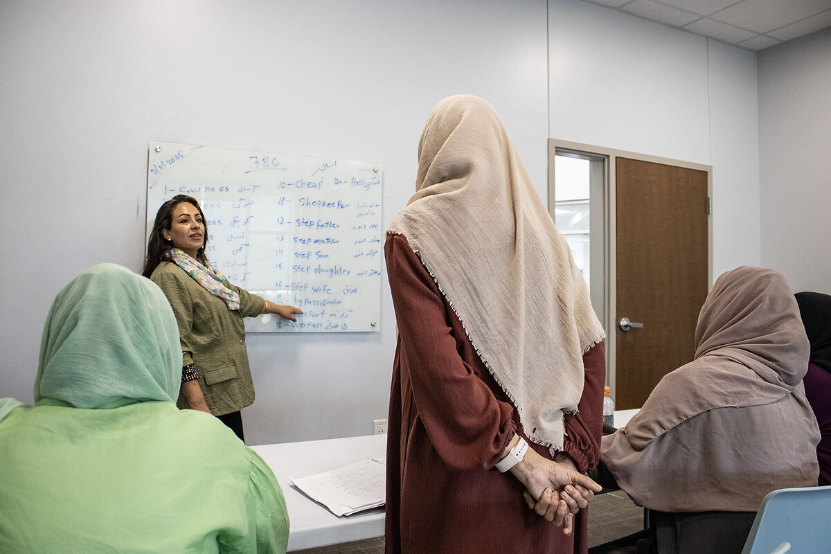 Across the room, another table of women reviews days of the week. Asked if they have family members who worked for the U.S. government, most raise their hands.