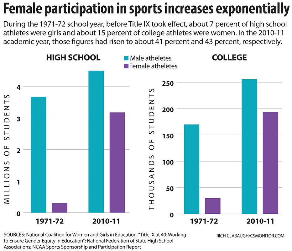 Athletics has been the realm where the law’s impact is most visible for several reasons, Maatz says. Men have gotten behind its promotion of athletic participation, partly because it has affected their sisters, daughters, and girlfriends. Also, it was followed up by policies that required detailed data collection, revealing the inequities in sports that have prompted action. Such data is not as readily accessible to show many other forms of sex discrimination.
