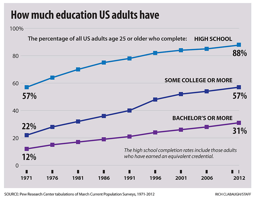 The portion of young adults in the United States who have completed a four-year college degree hit a record high in 2012. A full third of 25-to-29-year-olds now hold degrees.
