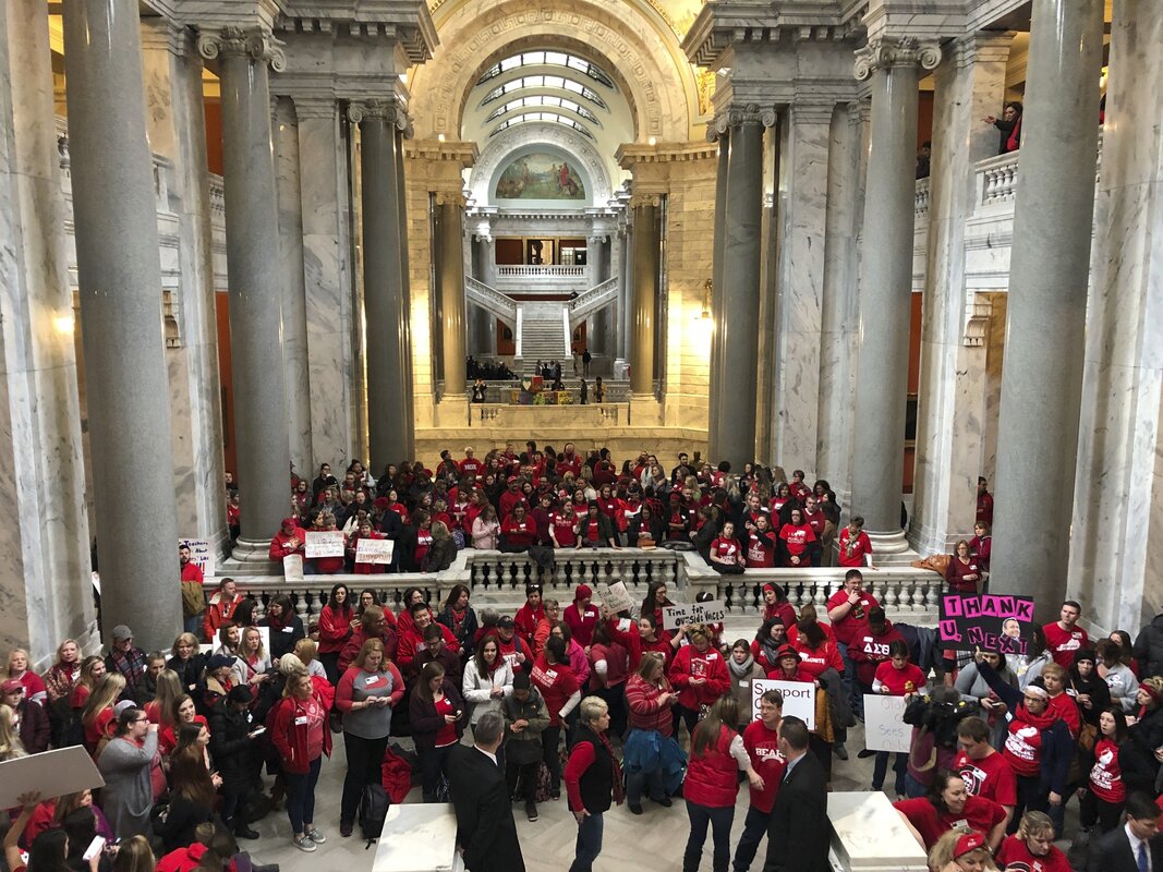 In Kentucky, teachers don't strike but they coordinate to all use their sick days on the same day, forcing districts to close because they don't have enough substitutes to cover classes. Hundreds of teachers wearing red shirts clogged the stairs leading to the House chamber, chanting so loudly they disrupted hearings before the state Supreme Court.
