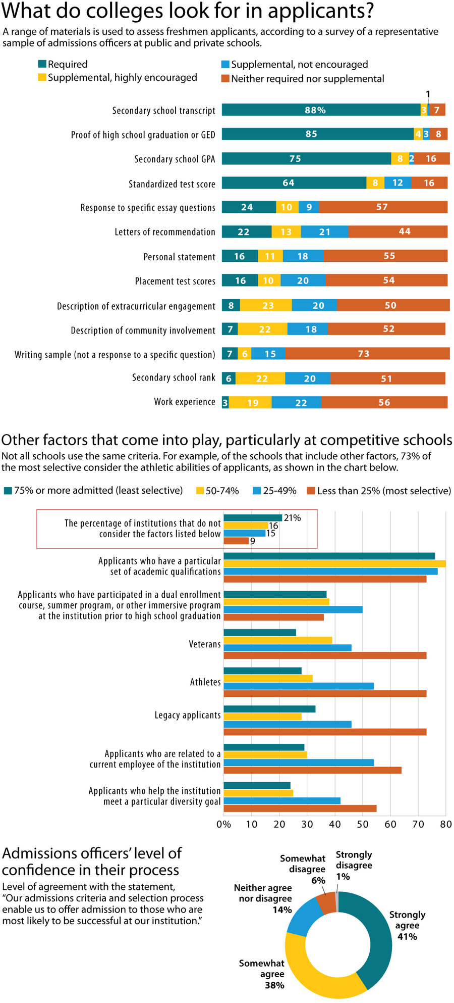 Just over a third of institutions don鈥檛 require applicants to submit SAT/ACT scores. Essay questions and personal statements? More than half don鈥檛 consider them.