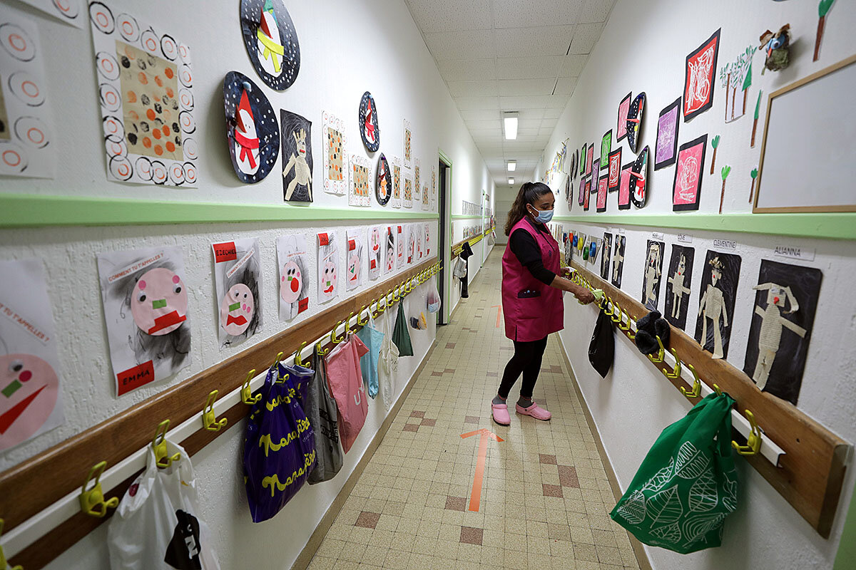 鈥淚 can鈥檛 leave out anything that鈥檚 shared between children,鈥 says Ms. Cocquerelle, who returned to school a few days ahead of Thursday鈥檚 official reopening.聽Even the class rabbit, Susie, has been removed from the classroom now that cleaners will be using bleach to disinfect the room at least twice a day. 鈥淚鈥檓 trying to figure out how I鈥檓 going to do this.鈥