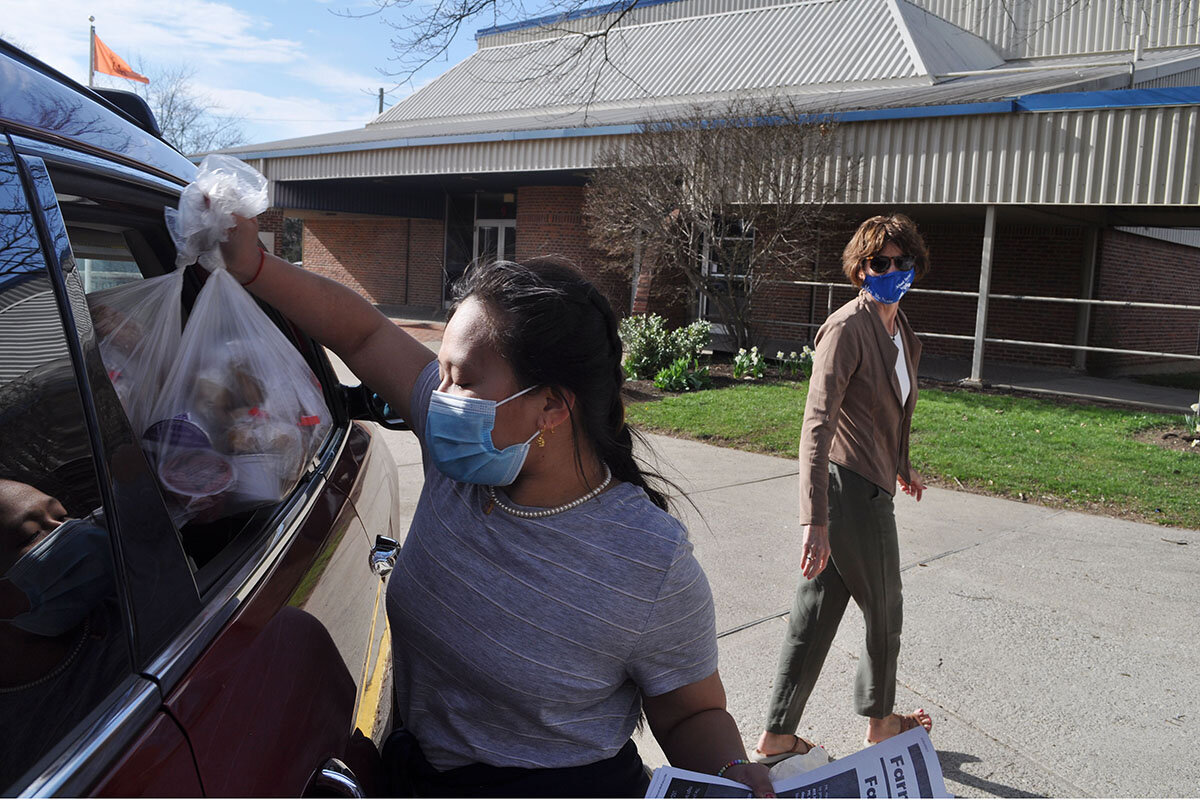 Ms. McNair, the school social worker, and her team set up shop multiple times a week to hand out free school meals to anyone who wants them. Parents pull up, drive-thru style, to maintain social distancing.聽