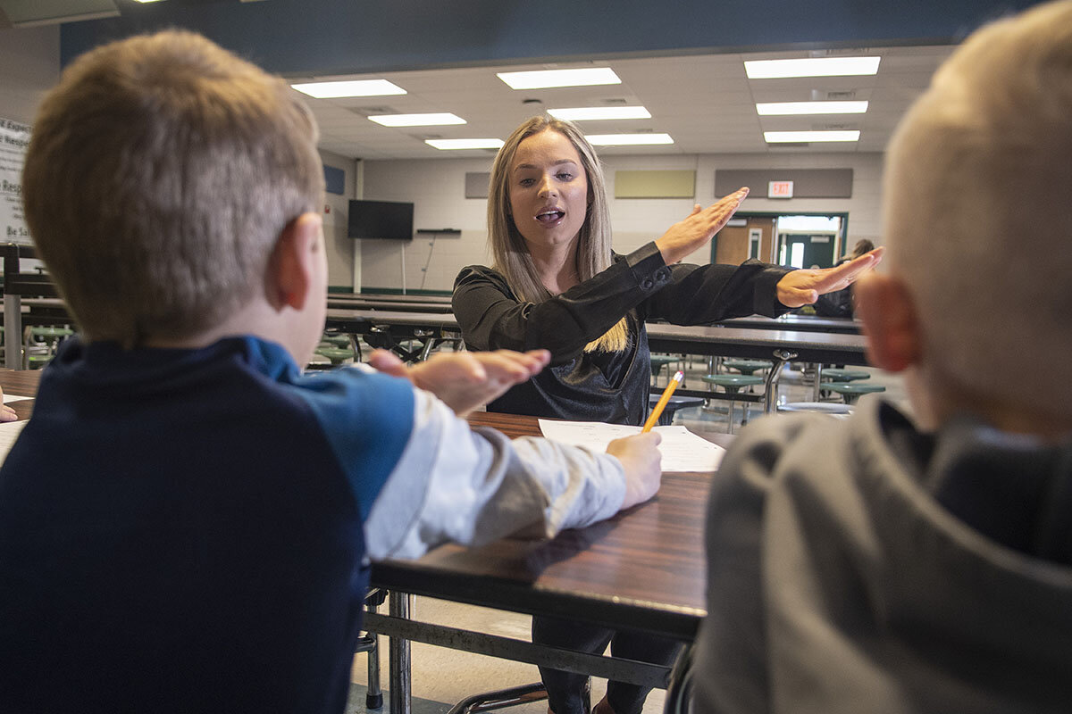 Emily Rock, a former physical education teacher who recently went back to school to earn her elementary teaching certificate, works with three boys at a long table at the back of the room. She reviews double final consonants, where the last two letters of a word form one sound, as in ball and class.