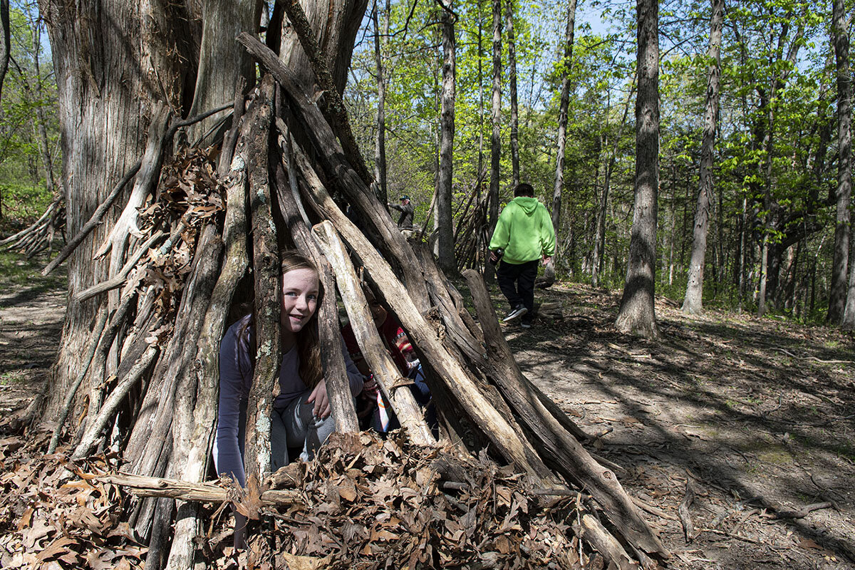 Down a hiking path and through the woods, giggles and chatter echo from a clearing where elementary students have just finished constructing makeshift shelters.