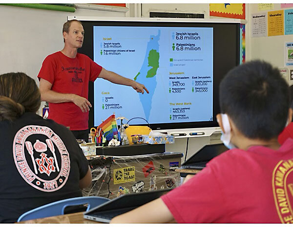 What that looks like at the Kawananakoa Middle School in Honolulu is students comparing and contrasting a natural disaster 鈥 the deadly Maui wildfire in August 鈥 with the human-created conflict in the Middle East. It also includes a teacher and student teacher pairing up to offer a lesson on recent history in Eastern Europe and the Middle East.