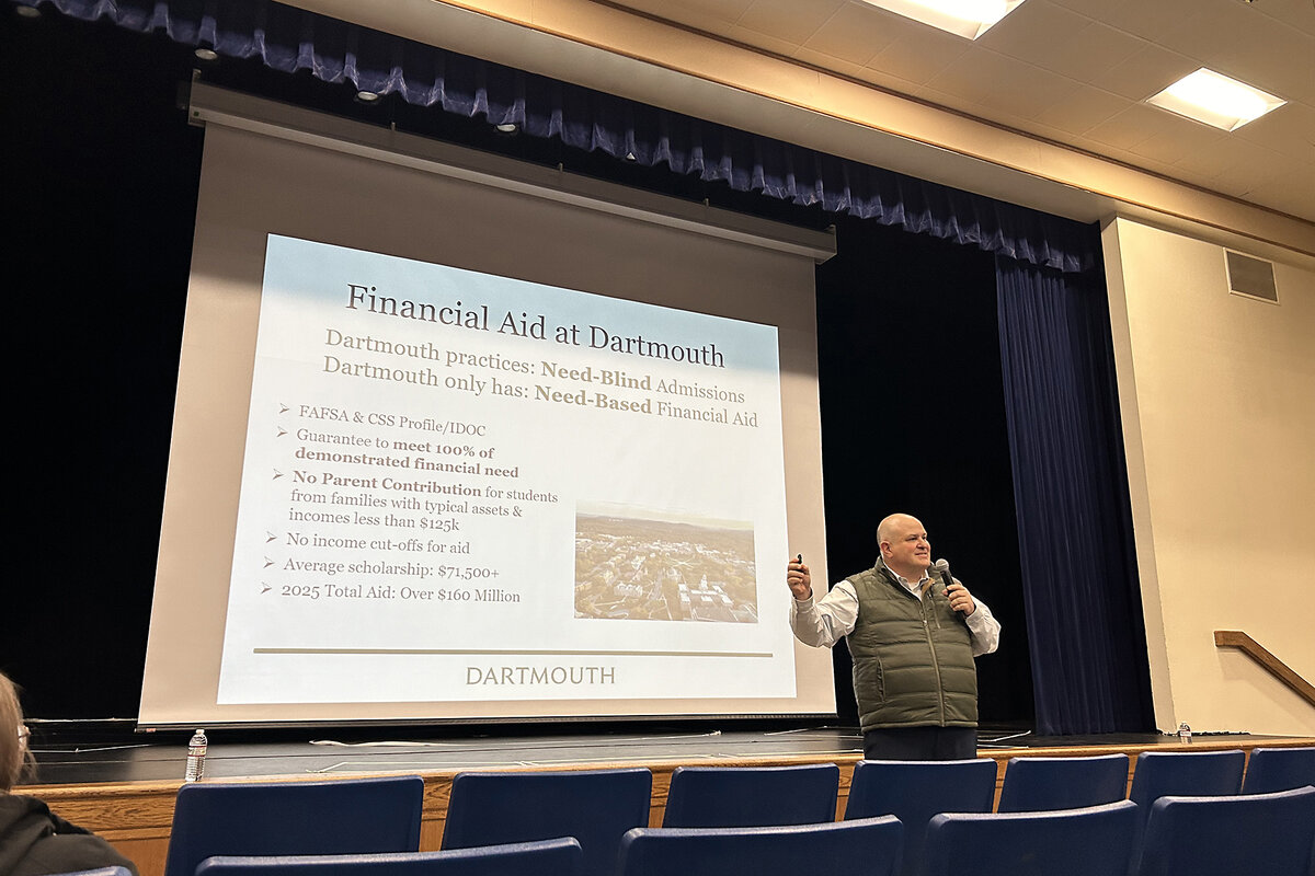 Norman Sackett, a senior who applied early decision to Dartmouth, attended the recent presentation by Mr. Koff. Mr. Sackett鈥檚 father is an MRI technologist and his mother works in early child care. When he entered their income into the U.S. Department of Education鈥檚 net price calculator, he learned his family would be asked to contribute just $5,000 鈥 a manageable amount. He鈥檒l find out if he got into Dartmouth later this month.