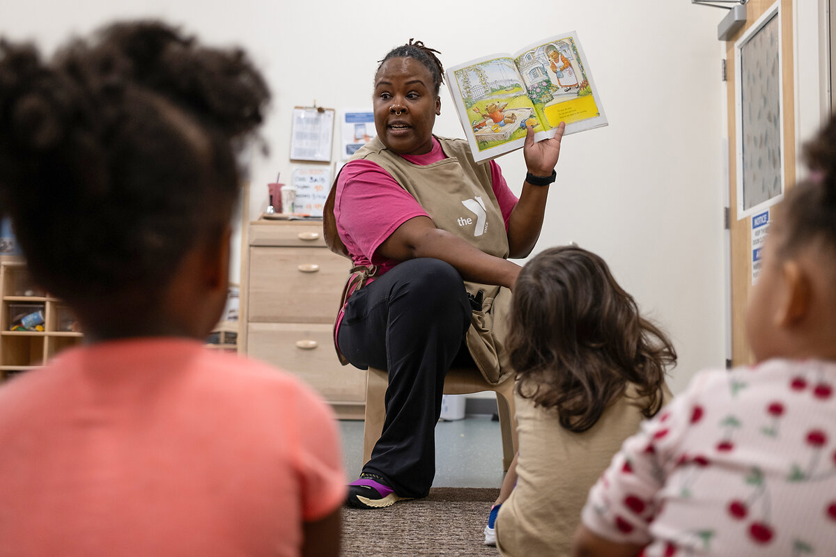 In a playground outside a YMCA, Mayra Aguilar rolled purple modeling dough into balls that fit easily into the palms of the toddlers sitting across from her. She helped a little girl named Wynter unclasp a bicycle helmet that she鈥檇 put on to zoom around the space on a tricycle.