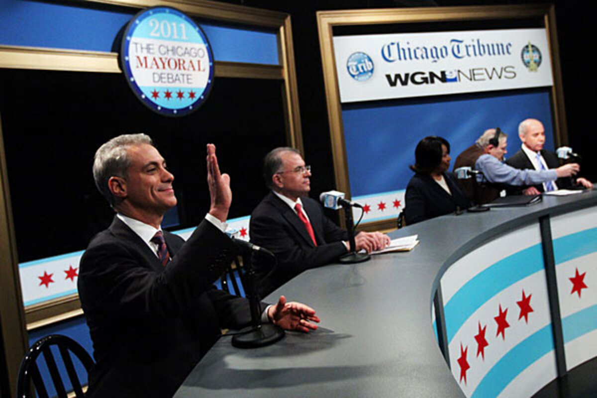 The four leading candidates are participating in a television debate Thursday night. Emanuel celebrated the decision by greeting rush hour commuters on an EL station stop in the downtown Loop.