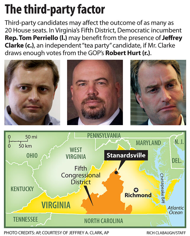 But there's still a conservative rival on the ballot: independent tea partyer Jeffrey Clark, who says he's getting pressure both from Republicans and tea party groups to exit the race so as not to split the conservative vote. "Some tea parties have become the strong arm of the Republican Party," said Mr. Clark, a property inspector from Danville, Va. "We get a lot of e-mails asking us to drop out, but they all start out the same way: 'We agree with what you stand for, but we don't want to risk [reelecting] Perriello.' "