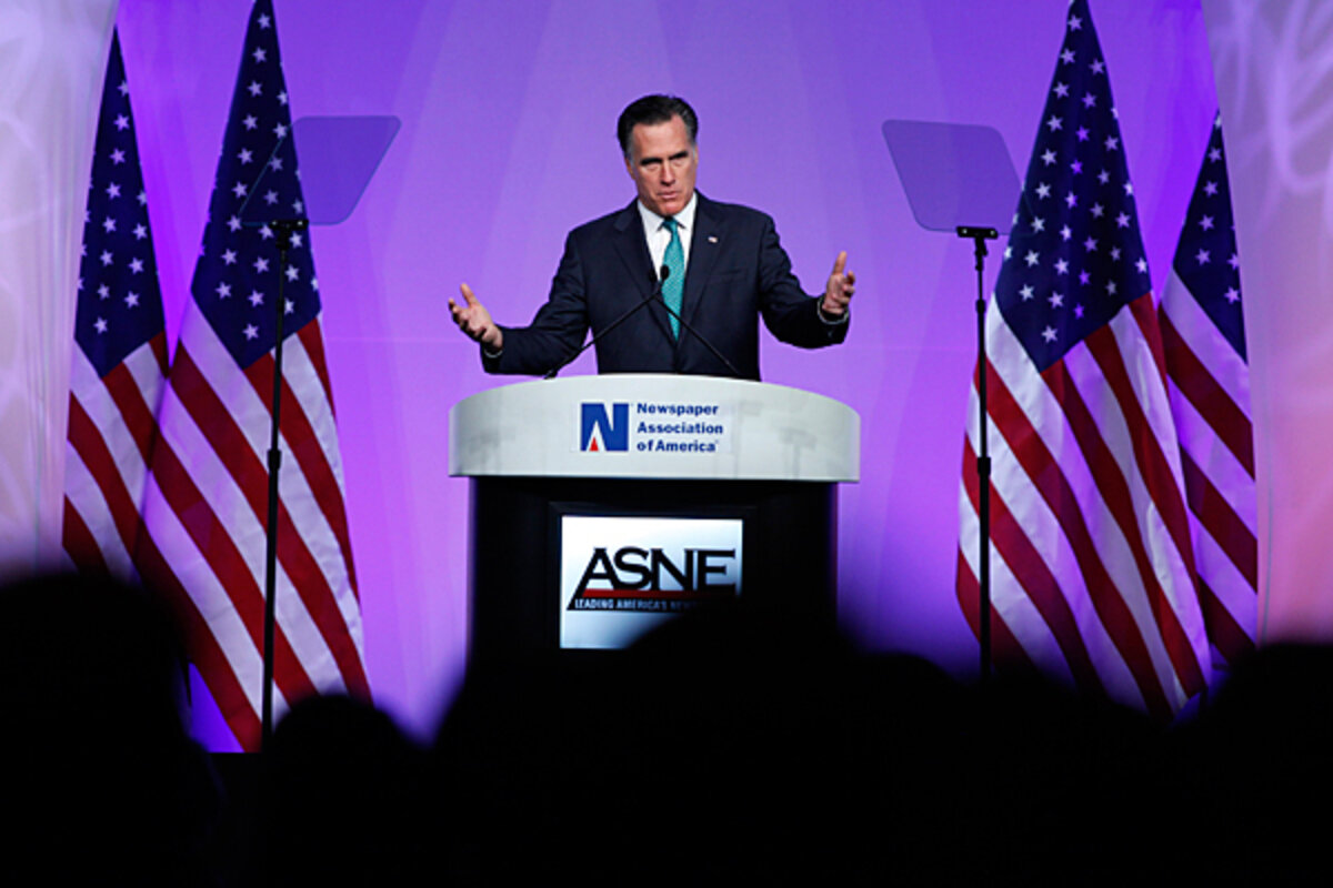 Mr. Romney was in Washington to address the Newspaper Association of America, and fresh off a sweep of Tuesday鈥檚 three primaries that tightened his grip on the GOP nomination. Obama, he said, had looked at the House Republican budget and pointed to 鈥渁ll the terrible things that would happen鈥 if cuts were made by the same percentage across the board. But that鈥檚 not how it would work, he said.