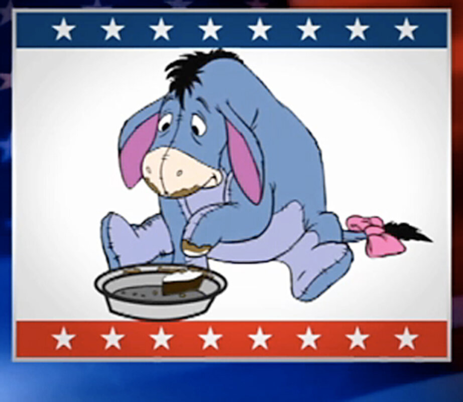 Comedian Stephen Colbert, said Tuesday night on "The Colbert Report," that the "Democrats' self-loathing has gotten so bad they've changed their symbol from the silhouette of a donkey to Eeyore eating a whole chocolate cheesecake."